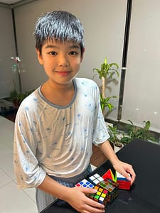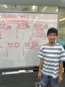 I love solving Rubik's cubes. My personal best for the 3x3 Rubik's cube is 57 seconds. I am still trying to improve this timing. I am able to solve 2x2, 3x3, 4x4, void cube, square 1, pyraminx, and skewb. Recently my father asked me to teach him how to solve the 3x3 Rubik's cube, which I was very happy to do. Watch this random Rubik's Cube Leaderboard Challenge at NUS High in 2025.